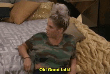 Elena Davies from Big Brother 19, also known as Bbelena, says 'Ok! Good talk!' while sitting on a bed.
