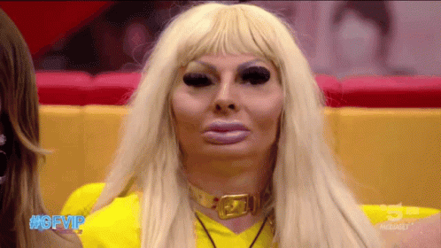 Elenoire Ferruzzi from Grande Fratello Vip, with blonde hair and purple lips, wearing a yellow top.