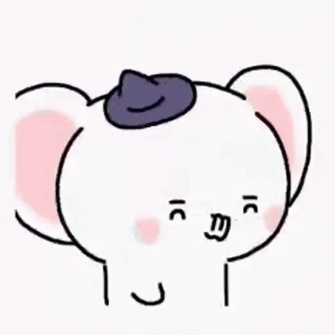 Cartoon elephant Dongwoon wearing a hat sneezes cutely, with pink cheeks and playful lines around.