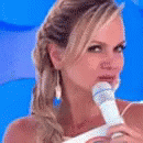 Brazilian TV host Eliana speaks into a microphone, then smiles charmingly at the camera.
