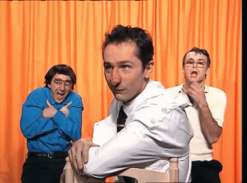 Elie Le and two men posing for a picture in front of a bright orange curtain, with one man laughing.