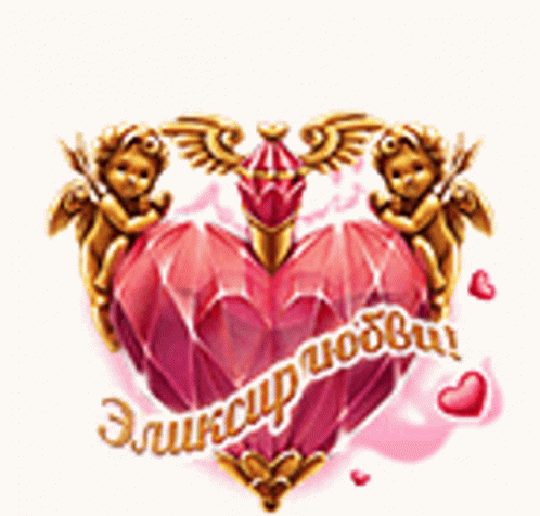 A beautiful pink heart-shaped elixir bottle with golden cherubs and wings, featuring the Russian word 'Эликсир'.