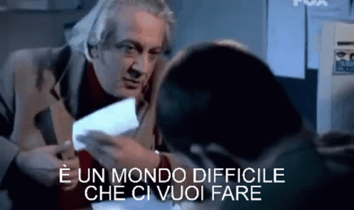 Elio from Boris holding a paper with the quote 'It's a difficult world, what can you do?'