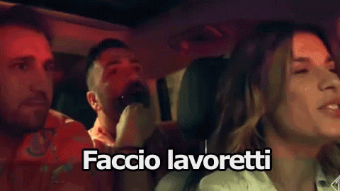 Elisabetta Canalis and friends in a car, discussing "faccio lavoretti" with a double meaning.