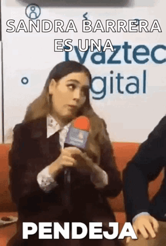 Danna Paola holding a microphone during an interview, with text about Sandra Barrera visible.