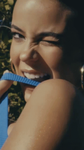 Ella Mendelsohn making a seductive face, playfully biting on a blue strap with a charming wink.