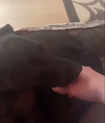 Jayden gently pets Ellen, a black dog, on a comfortable bed, showing their affectionate bond.