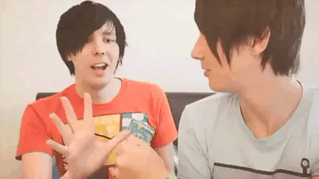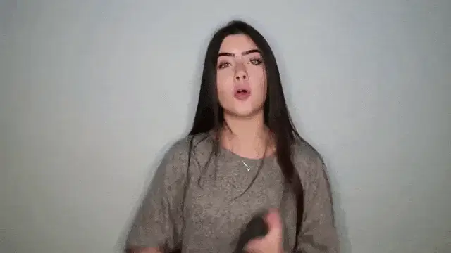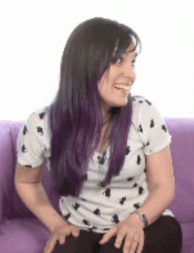 Ellen Rose (icklenellie) on a purple couch, smiling and pointing at the camera with purple-streaked hair.