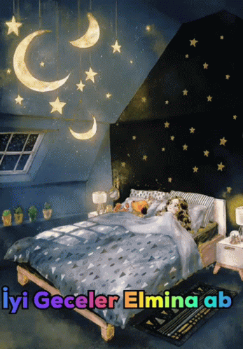 A cozy bedroom painting with glowing moons and stars, wishing 'Good Night Elmina ab'.