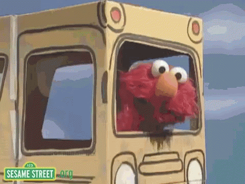 Elmo, the red monster from Sesame Street, looks out the window of a cardboard bus.