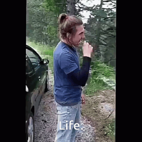 Elodrai brushes his teeth next to a car in a serene forest setting, embracing the simple 'Life.'