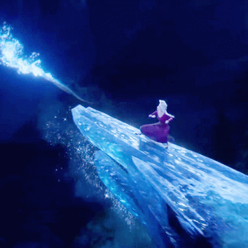 Elsa from Frozen, in a magenta dress, stands on an ice shard and reaches out with a distressed expression.
