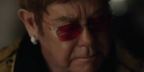 Elton John in a close-up shot, wearing red sunglasses, likely from the John Lewis Christmas advert.
