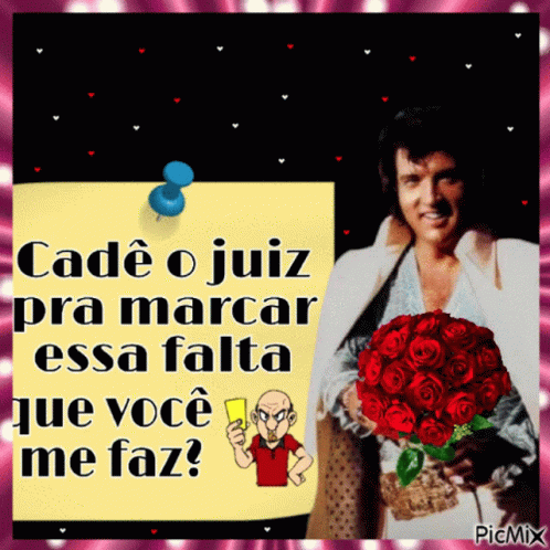 Elvis Presley holds red roses next to a sticky note asking 'Where's the referee for this foul?' with a cartoon judge.