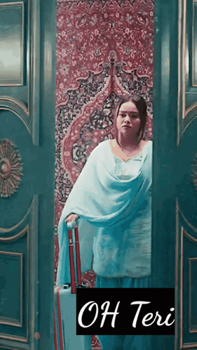 Elvisha Elvishaians stands in a doorway, holding a light blue suitcase with 'OH Teri' written on it, wearing a traditional outfit.
