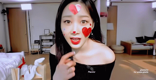 aespa's Giselle with heart stickers on her face, wearing a black off-shoulder top, playfully biting her lip.