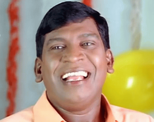 Vadivelu, wearing an orange shirt, shares an expressive laugh with the camera.