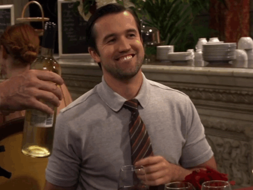 Rob McElhenney as Mac from It's Always Sunny in Philadelphia, smiling and holding a bottle of wine.
