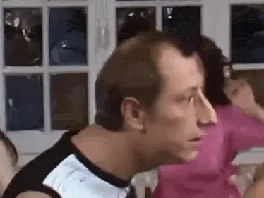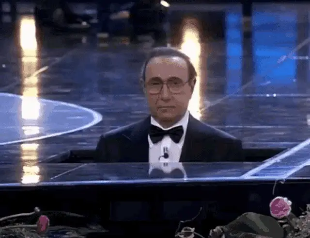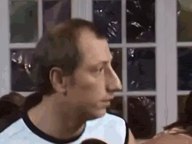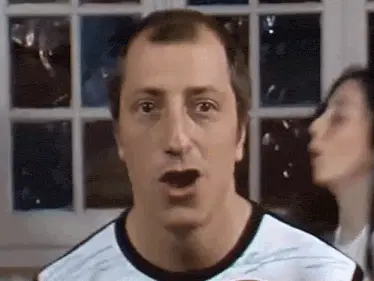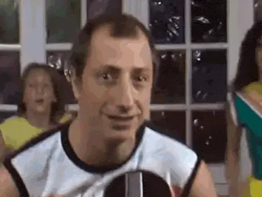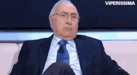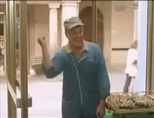 Paolo Hendel, as Pippo, in a blue jumpsuit holding a box of grapes from 'Emergenza Passera'.