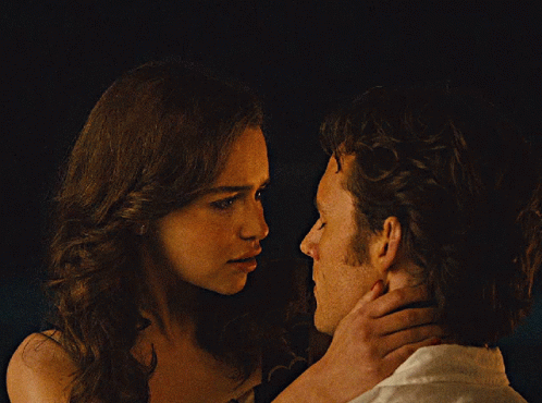 Emilia Clarke and Sam Claflin share an emotional, intimate moment, looking into each other's eyes.