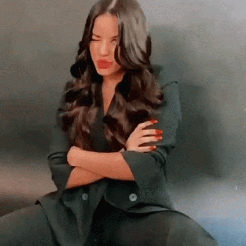 Emiliamernes posing playfully with crossed arms and a funny face, wearing a black blazer and red lipstick.