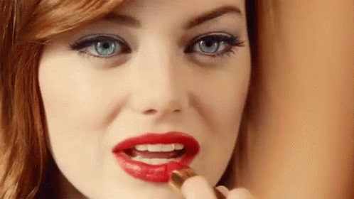 Emma Stone, with her striking blue eyes and red hair, applies vibrant red lipstick in a close-up shot.