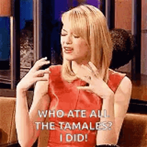 Emma Stone dramatically asks 'Who ate all the tamales?' and confesses 'I did!' with expressive gestures.