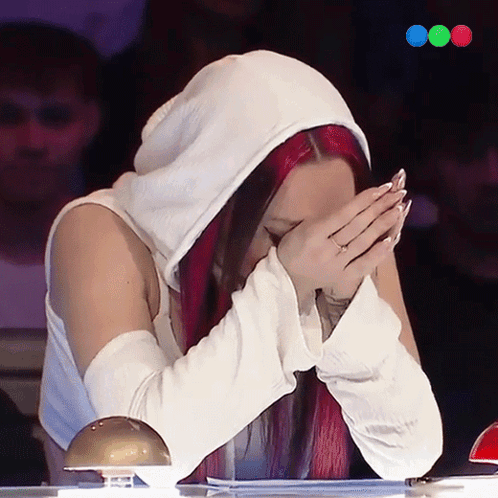 La Joaqui, with red hair and a white hoodie, gets emotional during Got Talent Argentina, covering her face.