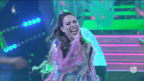 Lindsay Casinelli dancing with excitement and joy on stage, performing a vibrant Latin dance.