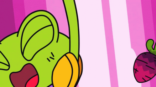 Flink, the excited green frog, celebrates as carrots and beets fall around him against a vibrant purple background.