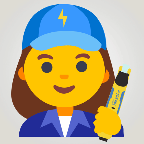 A winking emoji of a female electrician wearing a blue cap and holding a yellow Jokari cable knife.