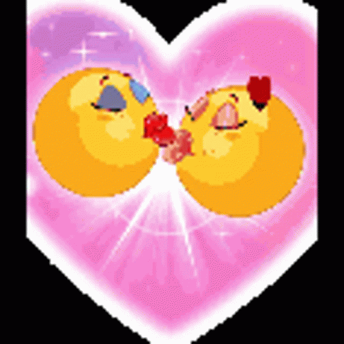 Two yellow emoji faces share a kiss within a sparkling pink heart, symbolizing love and affection.