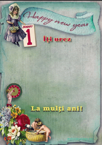A vintage-style Romanian New Year greeting card wishing a prosperous and successful year, featuring flowers and angels.