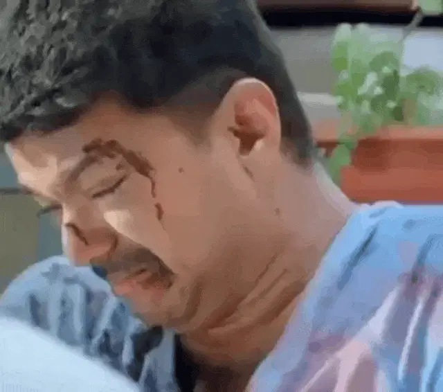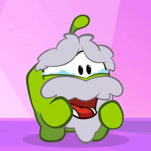 Om Nom, the green cartoon character with a gray mustache and beard, is crying emotionally.
