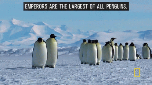 A group of Emperor Penguins walking in a line across a snowy Antarctic landscape, highlighting their large size.