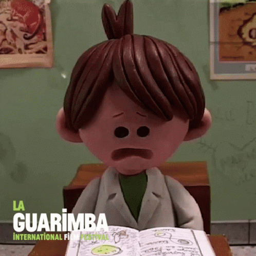 A sad cartoon character from La Guarimba International Film Festival looks heartbroken while reading a book.