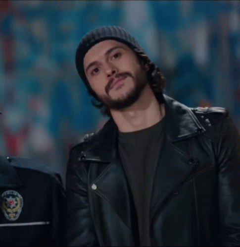 Emrah (Alperen Duymaz) from Çukur, wearing a black beanie and leather jacket, stands next to a police officer.