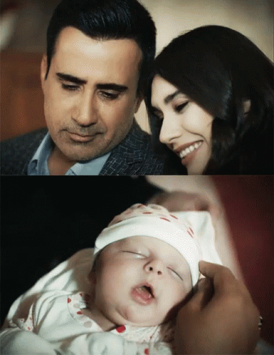 Emrah Erdoğan and Burcu Kıratlı lovingly hold their baby, a tender family moment from Aşk Ve Mavi.