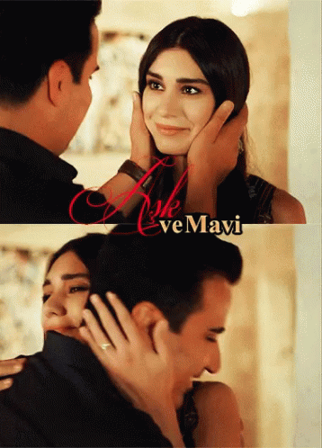 Emrah and Burcu share tender moments of affection, including kisses and hugs, from the series Aşk ve Mavi.