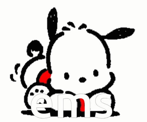 A black and white drawing of Pochacco, the Sanrio dog character, with the word 'ems' written below.