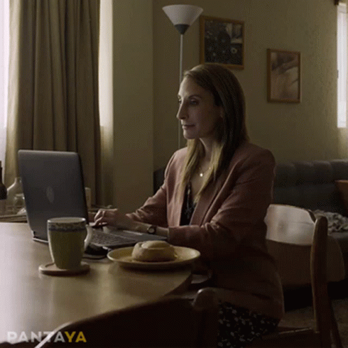 Monica Huarte as Nuria works on her laptop from home, enjoying a pastry and coffee.
