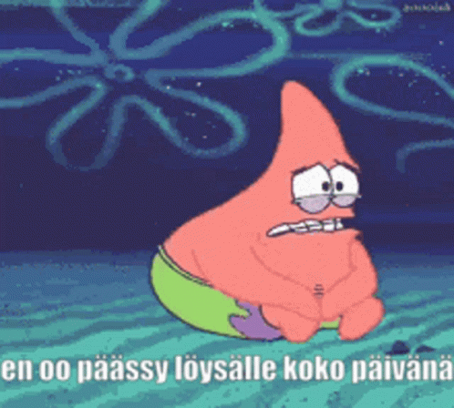 Patrick Star from SpongeBob SquarePants looks distressed with Finnish captions "En Pääse Löysälle Auta Pls".