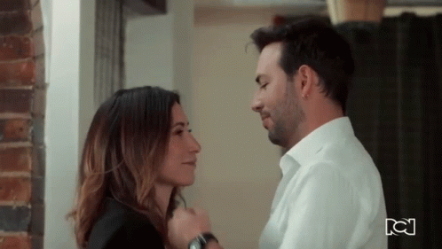 Miranda and Mauricio share a passionate kiss, expressing their love. From the Colombian telenovela Pa Quererte.