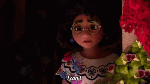 Encanto's Mirabel, with glasses and curly hair, looks distressed and says 'I can't'.
