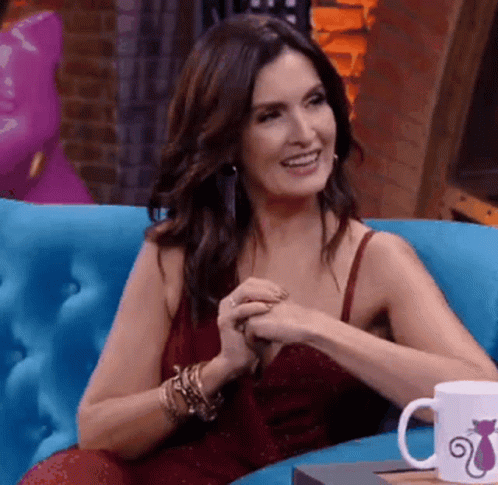Fátima Bernardes laughing heartily on the set of Encontro Com Fátima Bernardes, wearing a red dress.