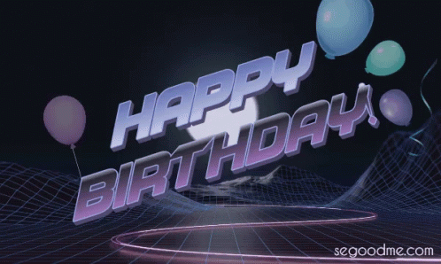 Animated 'Happy Birthday!' greeting with dynamic lightning effects, balloons, and a futuristic grid background.