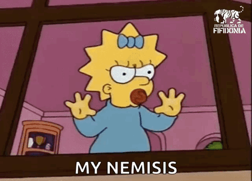 Maggie Simpson sees her nemesis, Gerald Samson, with the caption 'MY NEMISIS' in this classic Simpsons meme.