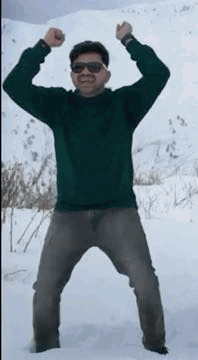 An energetic man in a green sweater and sunglasses happily dancing in a snowy landscape.