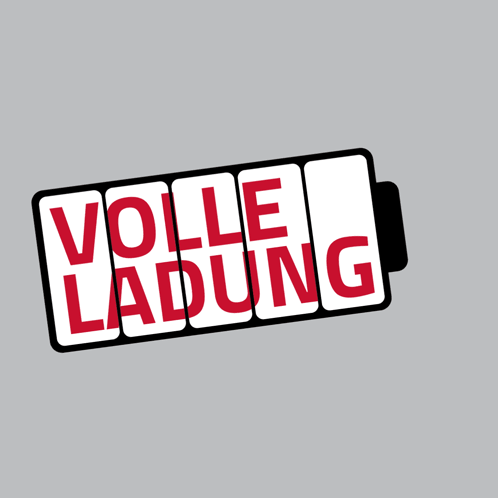An animated battery icon displaying 'VOLLE LADUNG' (Full Charge) and then filling up, emphasizing energy safety.