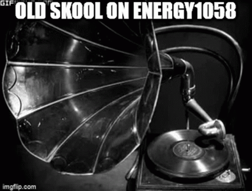 A black and white image of a vintage vinyl record player with 'Energy1058 Oldskool' text.